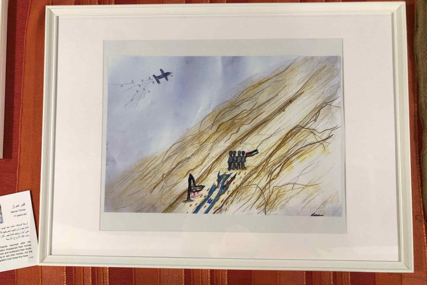 The project is the result of collaboration between many cultural associations, local authorities, public libraries, schools and universities. The exhibition at Gonzaga Campus is curated by Prof. Enrico Palumbo together with a group of young people. ‘This work is a perceptive and emotional diary,“ says Palumbo, ‘a unique testimony to the lives of the most honest people in a community in decline and a landscape ravaged by war: an exploration of the radical dimensions of human existence: relationships, bonds, places, home, nature, refuge, threat, fear, destruction, hope”. In the drawings of HeART of Gaza, the home is often wounded, destroyed, on fire. These images pose an important question: ‘What kind of “home” – of world, of relationships, of community – are we building together?’ All the children in this exhibition have been displaced. Many of their homes have been destroyed. Two young artists, Reema and Hammad, were killed, along with almost their entire family, in a bombing on 30 October 2023.