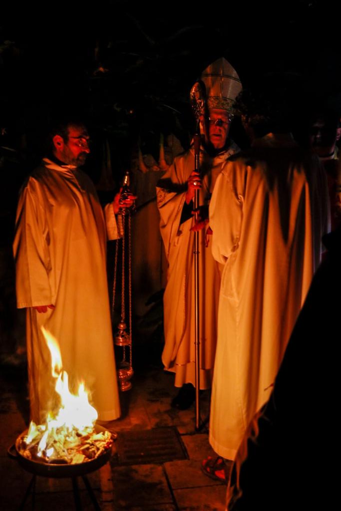 So, we plunge into the rubble of the cathedral and bring out furniture that can be salvaged and give it a good cleaning. We need an intense shower. We store them in some rooms that are still standing in the structure. In the afternoon, we start preparations for the Vigil which is the greatest of all vigils to make it more beautiful for a community that has suffered so much and needs more than usual to feel accompanied and loved. So, between volunteers and nuns, we cleaned the small garden of St George’s, we procured and prepared beautiful flowers, we recovered a stable pedestal for the Easter candle, we retrieved the materials for the brazier of the new fire and chose the songs for the liturgy, and we identified those who would read… A little bit of Italian and a little bit of Turkish, with an Argentinean nun who acted as a link between these two worlds! It was truly a special grace to have such an experience and breathe in such a Church!