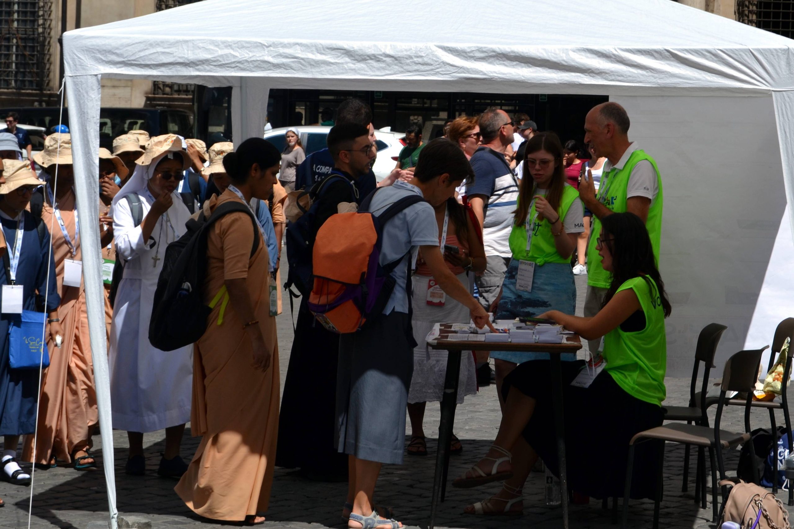 “Many of us were part of the MAG+S group, coming from different places, with stories to tell and different tasks to carry out, but we all shared the same goal: to love others through service. We opened our hearts and put on our fluorescent green vests, becoming volunteers ready to welcome others.”